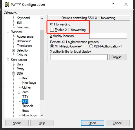 此时我们通过putty打开一个ssh时,默认打开"Enable X11 forwarding"即可。