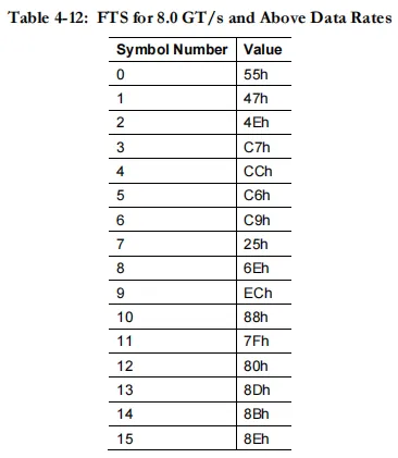 在L0s到L0过渡时用于位锁定和符号锁定,FTS的符号信息如下