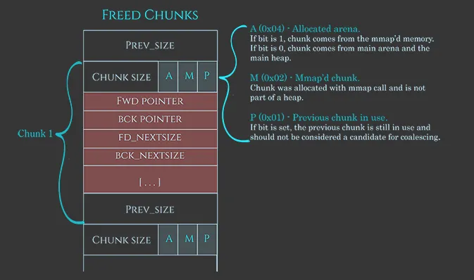 struct malloc_chunk { size_t mchunk_prev_size; /* Size of previous chunk (if free). */ size_t mchunk_size; /* Size in bytes, including overhead. */ struct malloc_chunk* fd; /* double links -- used only if free. */ struct malloc_chunk* bk; /* Only used for large blocks: pointer to next larger size. */ struct malloc_chunk* fd_nextsize; /* double links -- used only if free. */ struct malloc_chunk* bk_nextsize; };